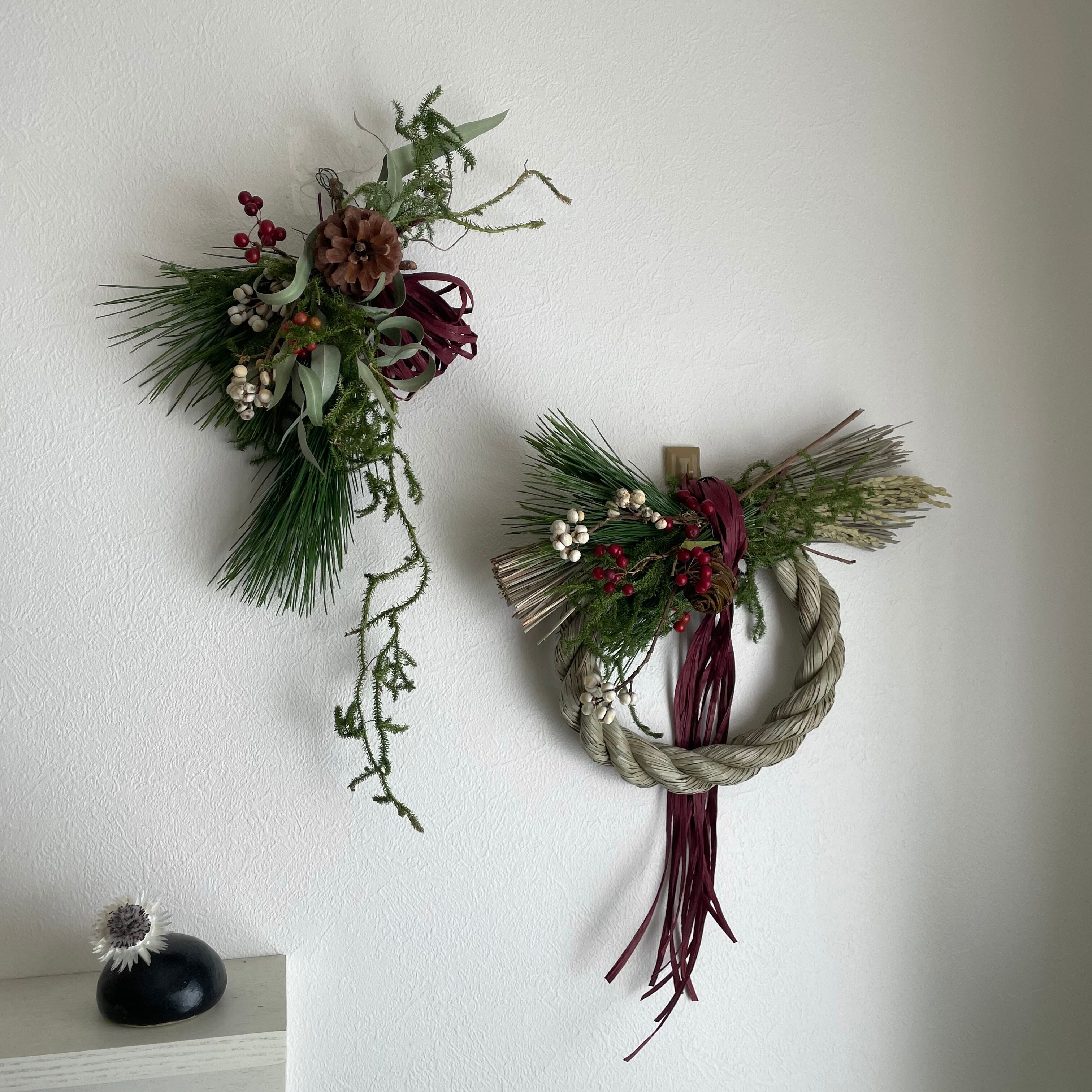 左側のスワッグタイプ。しめ縄はありませんが、お正月にぴったりの縁起物の花材をたくさん詰め込んで、右の苑よりグリーンを多くあしらっています。